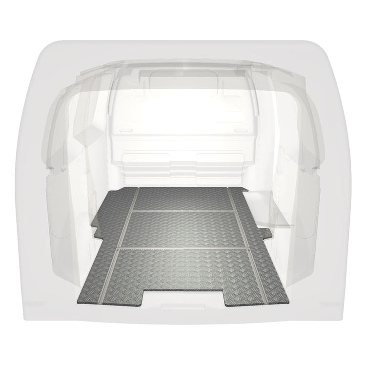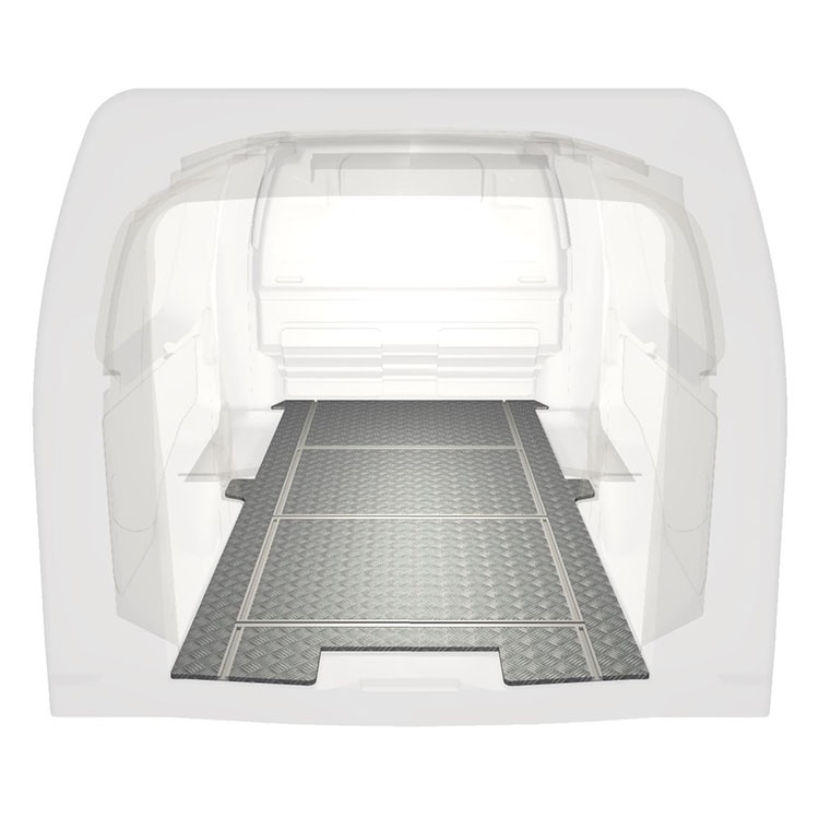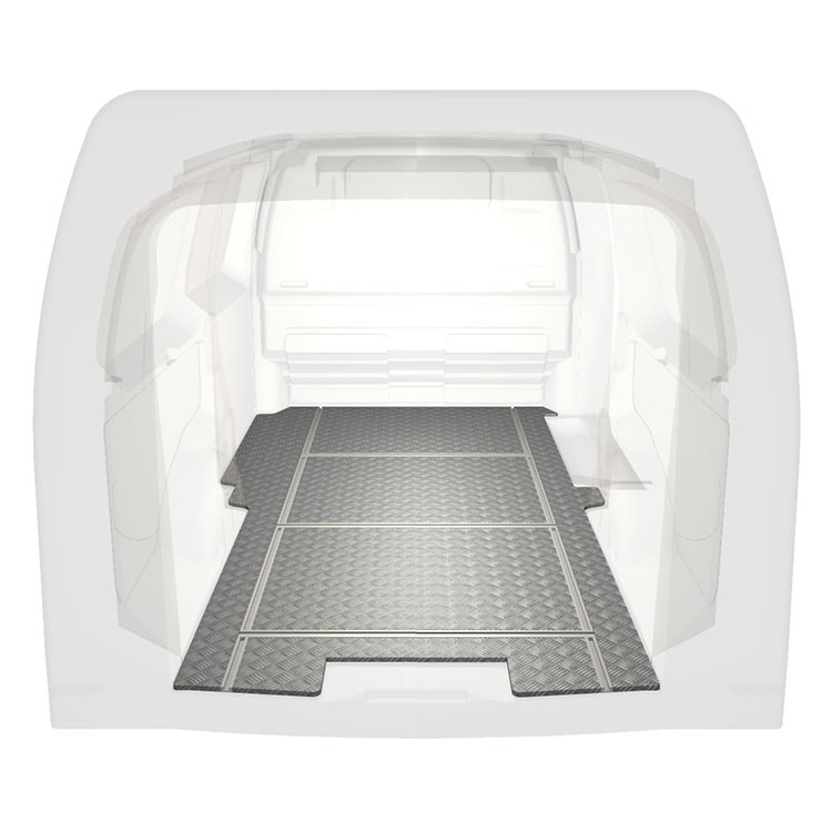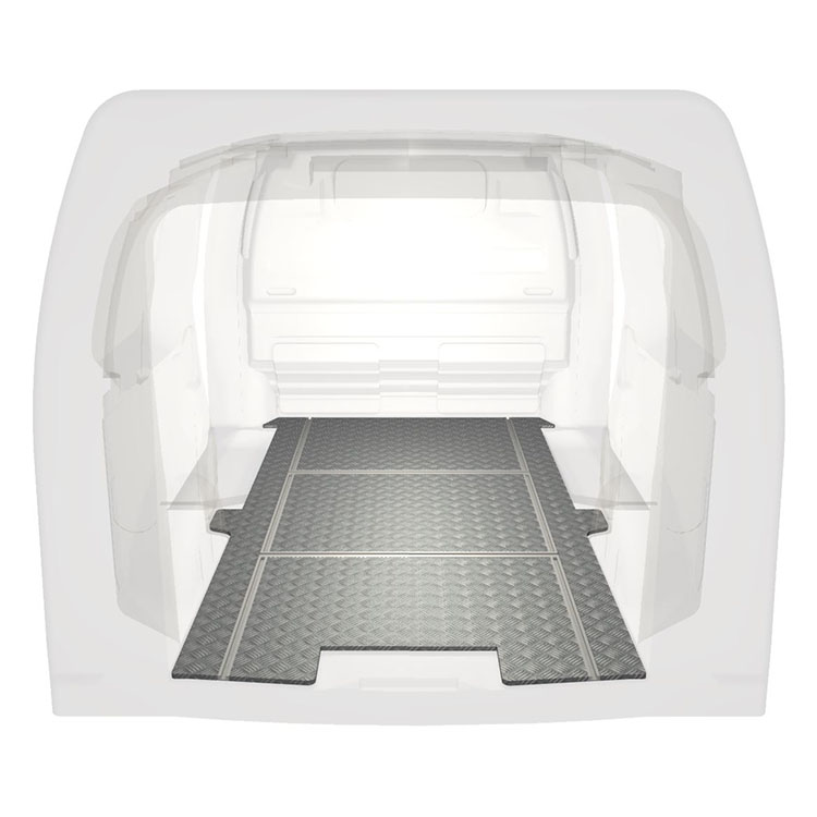 Vores lette og robuste gulv med tværgående skinner, der fås til et bredt udvalg af varebilsmodeller, leveres med skridsikker aluminiumsplade og lastskinner (langsgående og tværgående) til hurtig og sikker installation af indretningssystemer og andet tilbehør. Gulvinstallationen kræver ikke boring og monteres med stærkt klæbende lim, som er stærkere end møtrikker og bolte og beskytter køretøjets restværdi.