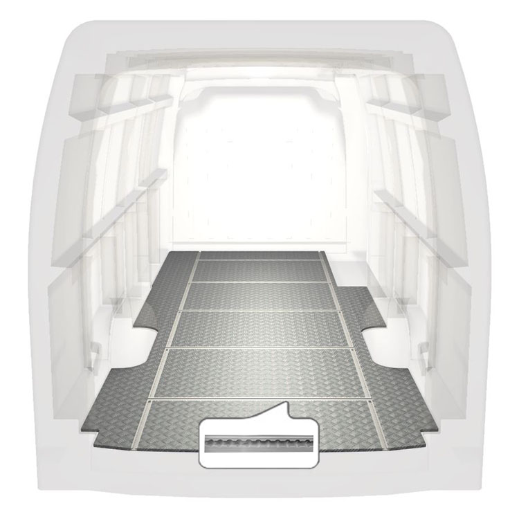 Vores lette og robuste gulv med tværgående skinner, der fås til et bredt udvalg af varebilsmodeller, leveres med skridsikker aluminiumsplade og lastskinner (langsgående og tværgående) til hurtig og sikker installation af indretningssystemer og andet tilbehør. Gulvinstallationen kræver ikke boring og monteres med stærkt klæbende lim, som er stærkere end møtrikker og bolte og beskytter køretøjets restværdi.