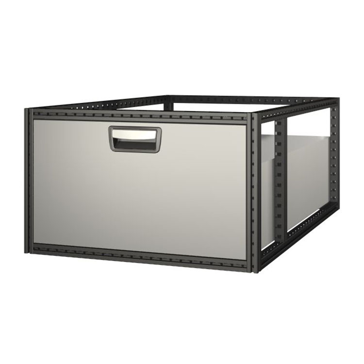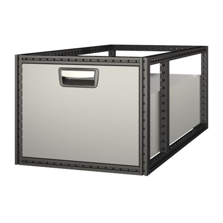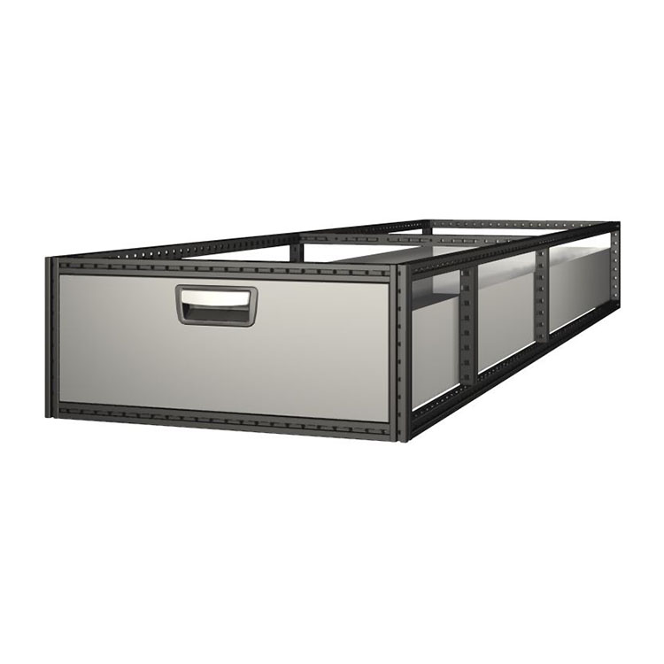 De ekstra lange skuffer er designet til tunge, voluminøse genstande og har en lasteevne på 80 kg pr. skuffe med et maksimum på 200 kg pr. skuffeenhed. Hvis der bruges gummibeklædte indlægsplader, øges lasteevnen til 100 kg pr. skuffe. Skufferne kan trækkes ca. 80 procent ud og fås i dybder på op til 2 m. Du kan frit kombinere dem, så de passer perfekt til din last og dit køretøj. Skufferne er som standard udstyret med kuglelejer og CRP (Crash Restraint Panel). Sidstnævnte forhindrer, at tung last kastes fremad i tilfælde af en ulykke.