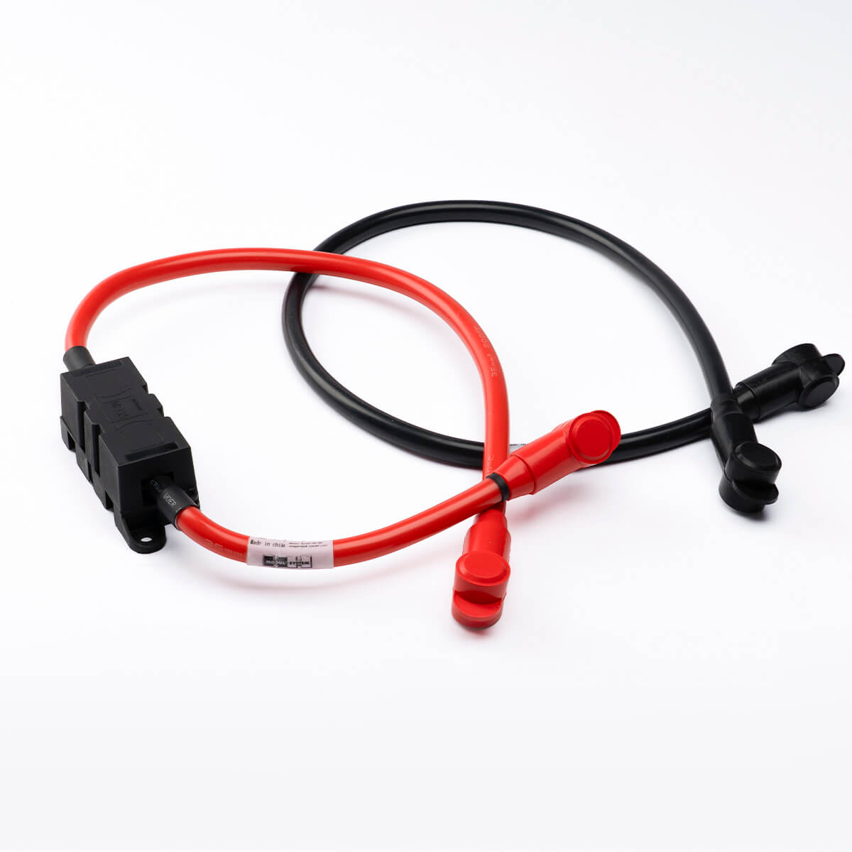 0.8-meter battery cables designed for the 28420-03 e-Heate 2000. Pre-fitted with M8 ring terminals, pole protection caps, fuse holder, and fuse.