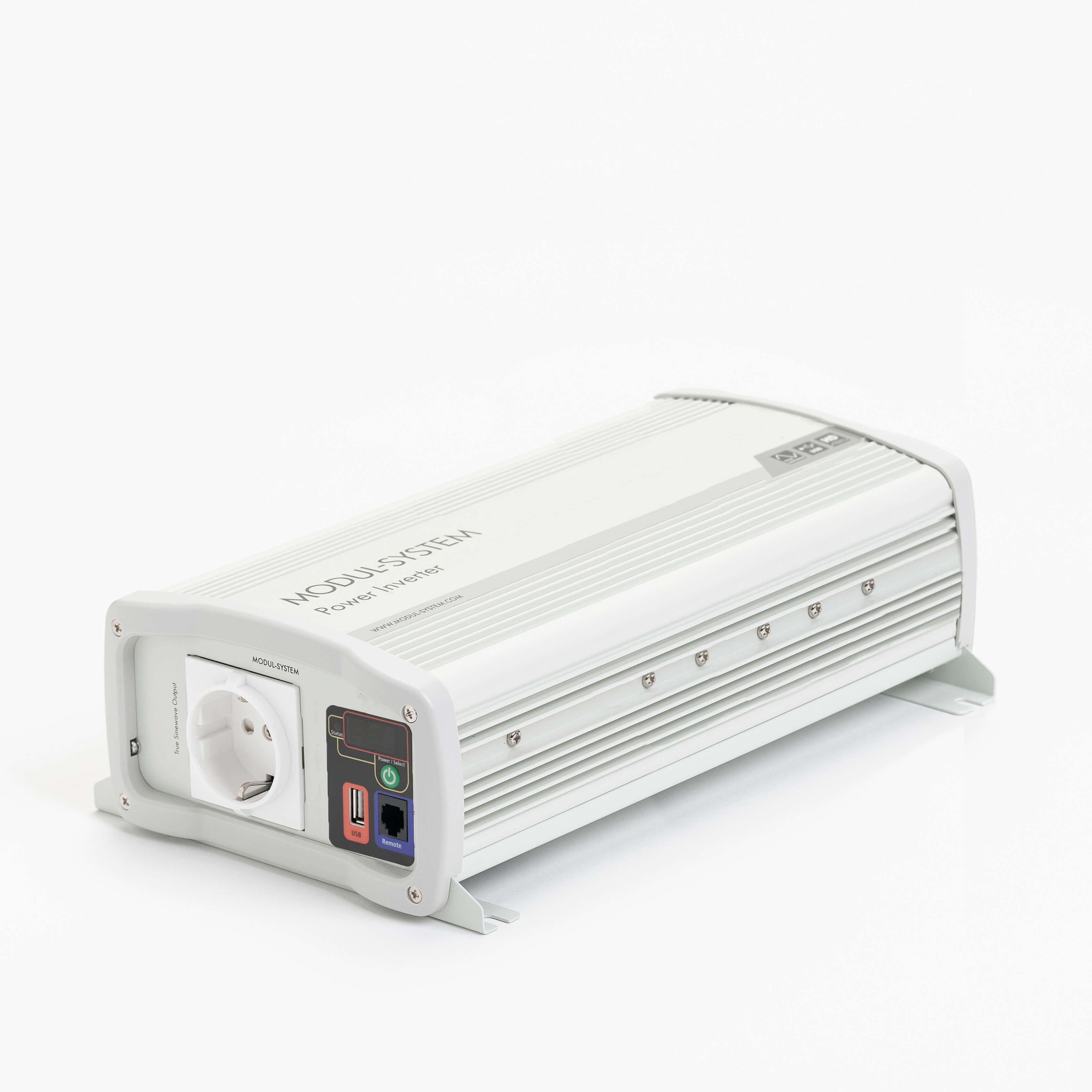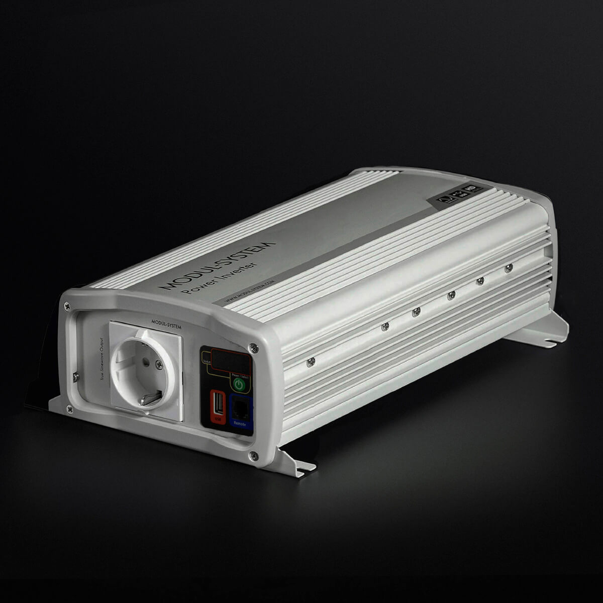 Inverter med ren sinusbølge, som omformer batteriets jævnstrøm (DC) til vekselstrøm (AC). Inverteren er CE-mærket, E-mærket og testet med hensyn til elektromagnetisk kompatibilitet (EMC).
