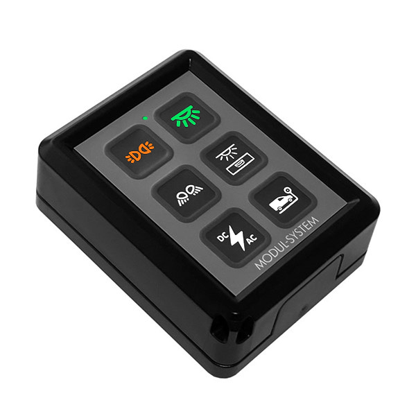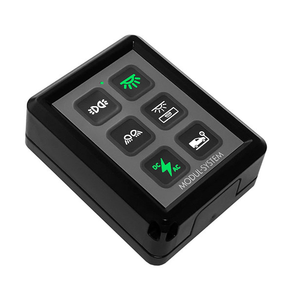 Baggrundsbelyst switchpanel, der er designet til at passe ind i køretøjets førerhus eller lastområde. Baggrundsbelyste switches gør det nemt for brugeren at se, hvilket tilbehør der er tændt. Ved installation er det muligt at vælge mellem grønne eller orange symboler.