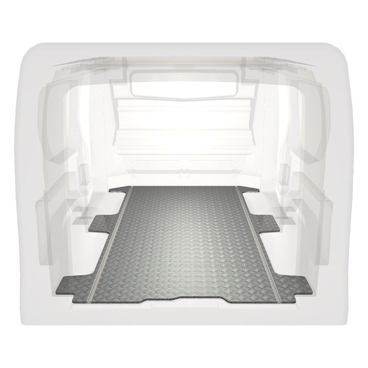 Lette og robuste standardgulve til varebiler til en Renault Trafic / Opel Vivaro / Fiat Talento / Nissan NV300 med skridsikker aluminiumsplade og lastskinner (langsgående) for hurtig og sikker installation af indretningssystemer og andet tilbehør.