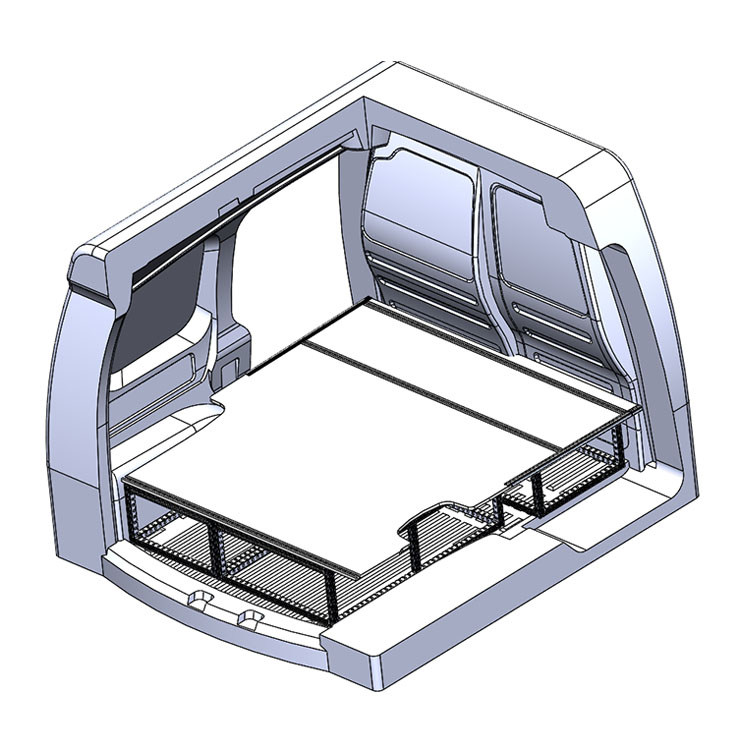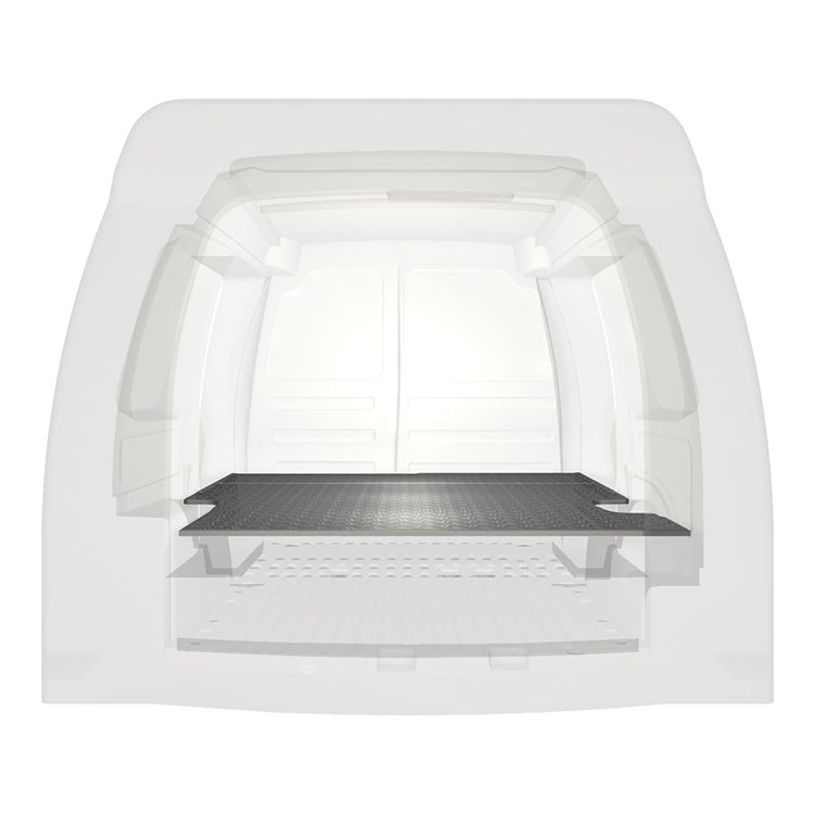 Double floor for a Volkswagen Caddy 2016-. The floor is designed to fit an extra-long drawer solution with one drawer unit 648x972x270 and one 486x972x270 coming out from the rear doors, and one drawer unit 486x1296x270 coming out from the side door.