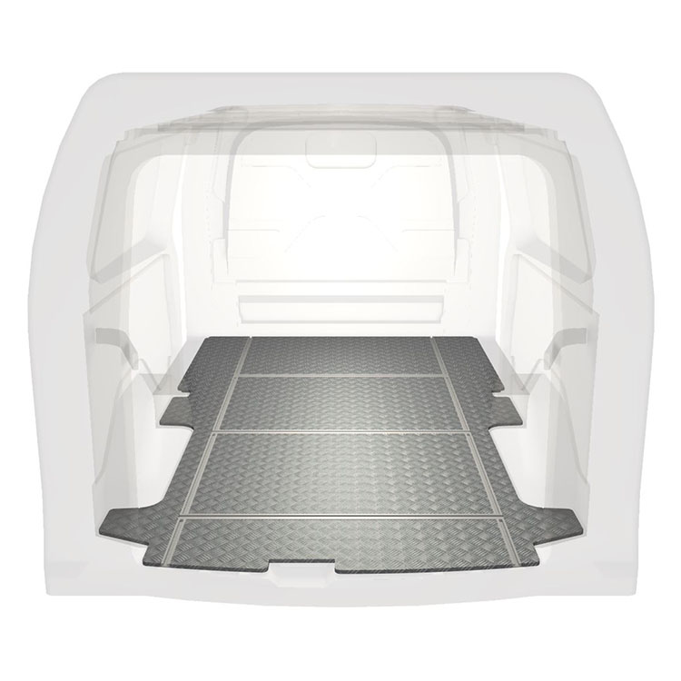 Lette og robuste gulve til varebiler med tværgående skinner til en Ford Transit Custom med skridsikker aluminiumsplade og lastskinner (langsgående og tværgående) for hurtig og sikker installation af indretningssystemer og andet tilbehør.