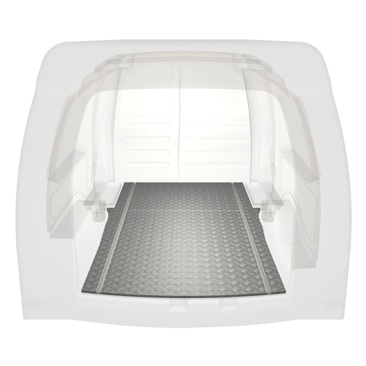 Lette og robuste standardgulve til varebiler til en Volkswagen Caddy Maxi med skridsikker aluminiumsplade og lastskinner (langsgående) for hurtig og sikker installation af indretningssystemer og andet tilbehør.
