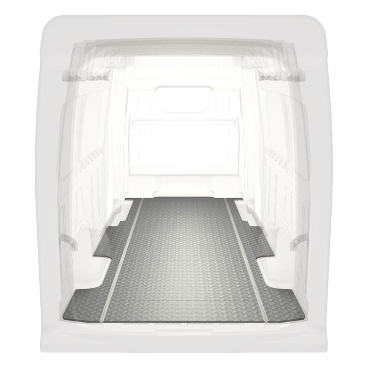 Lette og robuste standardgulve til varebiler til en Volkswagen Crafter / MAN TGE med skridsikker aluminiumsplade og lastskinner (langsgående) for hurtig og sikker installation af indretningssystemer og andet tilbehør.
