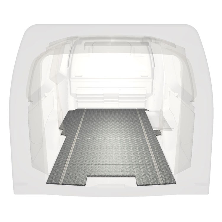 Lette og robuste standardgulve til varebiler til en Citroën Jumpy / Peugeot Expert / Toyota ProAce med skridsikker aluminiumsplade og lastskinner (langsgående) for hurtig og sikker installation af indretningssystemer og andet tilbehør.