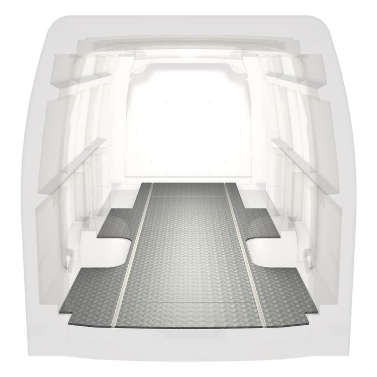 Lette og robuste standardgulve til varebiler til en Renault Master / Opel Movano / Nissan NV400 med skridsikker aluminiumsplade og lastskinner (langsgående) for hurtig og sikker installation af indretningssystemer og andet tilbehør.