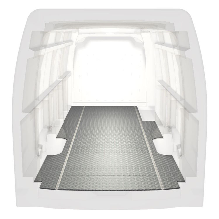 Lette og robuste standardgulve til varebiler til en Renault Master / Opel Movano / Nissan NV400 med skridsikker aluminiumsplade og lastskinner (langsgående) for hurtig og sikker installation af indretningssystemer og andet tilbehør.