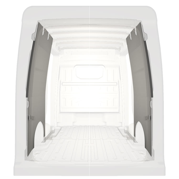 Let komplet beklædning til de indvendige vægge i en Volkswagen Crafter / MAN TGE med dobbelte sidedøre. Beklædningen skaber et lyst og behageligt arbejdsmiljø og er nem at rengøre.