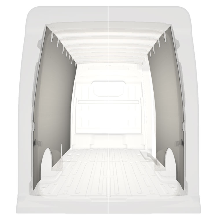 Let komplet beklædning til de indvendige vægge i en Volkswagen Crafter / MAN TGE med en sidedør til højre.Beklædningen skaber et lyst og behageligt arbejdsmiljø og er nem at rengøre.
