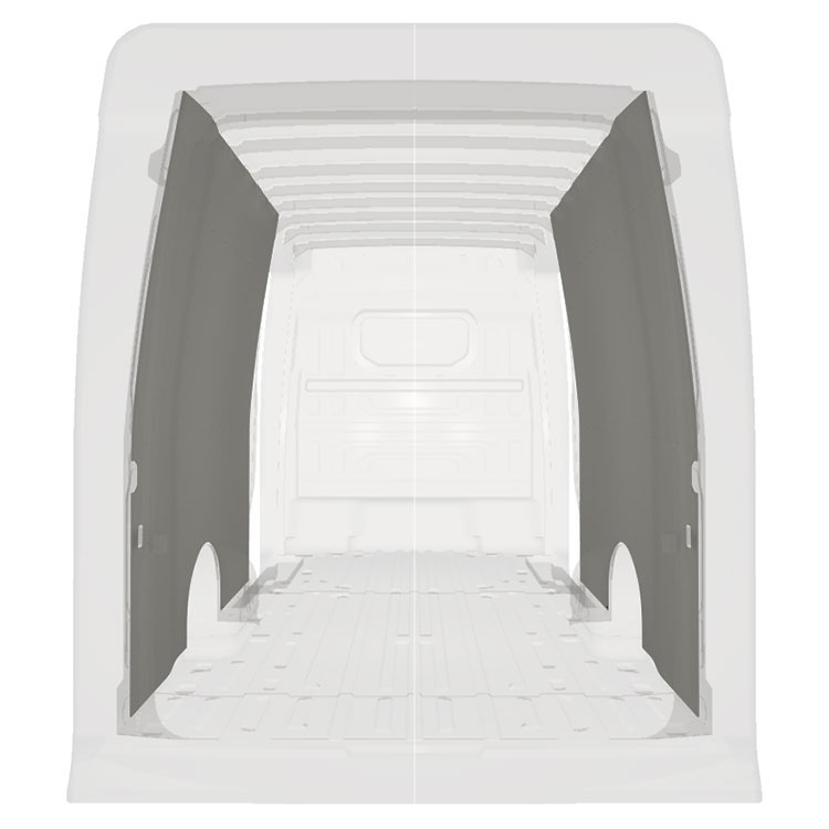 Let komplet beklædning til de indvendige vægge i en Volkswagen Crafter / MAN TGE med dobbelte sidedøre. Beklædningen skaber et lyst og behageligt arbejdsmiljø og er nem at rengøre.