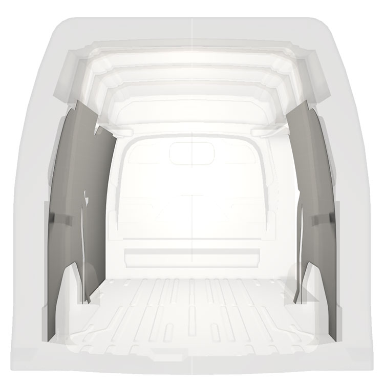 Let komplet beklædning til de indvendige vægge i en Ford Transit Custom med en sidedør til højre.Beklædningen skaber et lyst og behageligt arbejdsmiljø og er nem at rengøre.