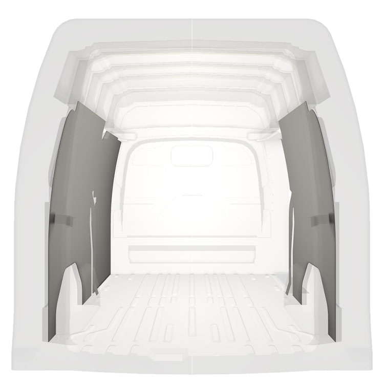 Let komplet beklædning til de indvendige vægge i en Ford Transit Custom med en sidedør til højre.Beklædningen skaber et lyst og behageligt arbejdsmiljø og er nem at rengøre.