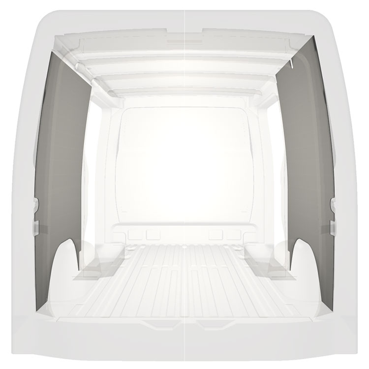 Let komplet beklædning til de indvendige vægge i en Mercedes Sprinter med dobbelte sidedøre. Beklædningen skaber et lyst og behageligt arbejdsmiljø og er nem at rengøre.