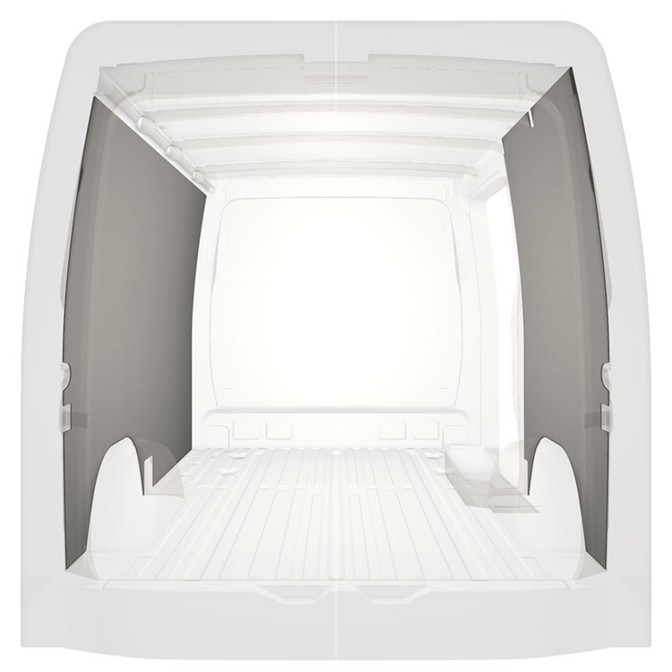 Let komplet beklædning til de indvendige vægge i en Mercedes Sprinter med en sidedør til højre.Beklædningen skaber et lyst og behageligt arbejdsmiljø og er nem at rengøre.