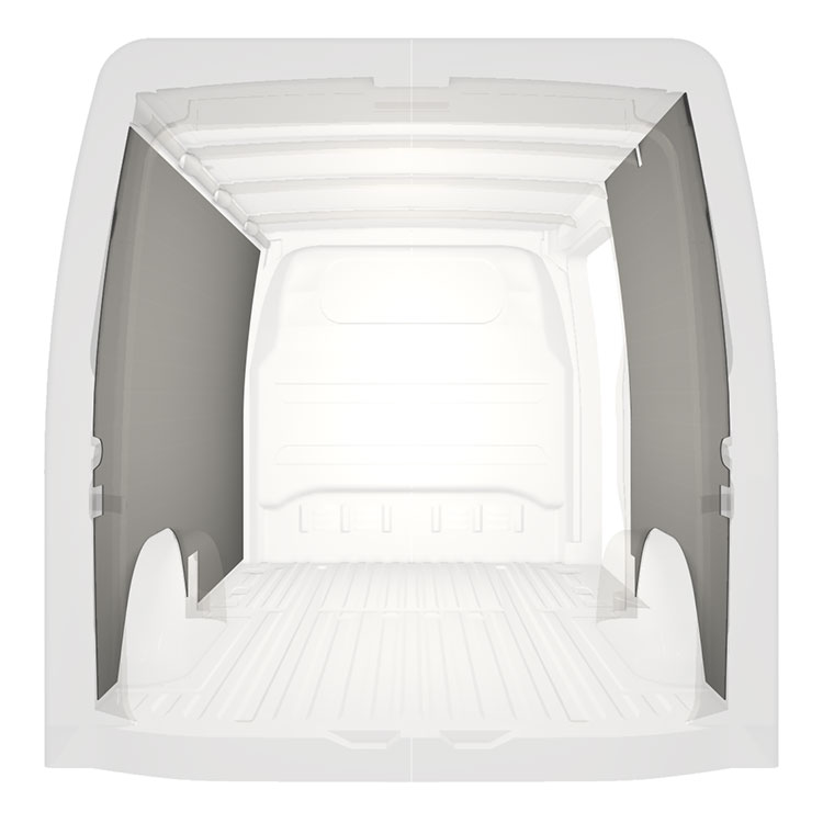 Let komplet beklædning til de indvendige vægge i en Mercedes Sprinter med en sidedør til højre.Beklædningen skaber et lyst og behageligt arbejdsmiljø og er nem at rengøre.