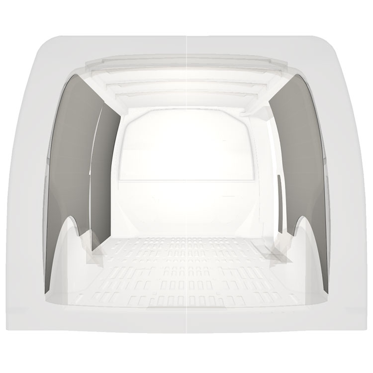 Let komplet beklædning til de indvendige vægge i en Volkswagen Transporter T6 med en sidedør til højre.Beklædningen skaber et lyst og behageligt arbejdsmiljø og er nem at rengøre.