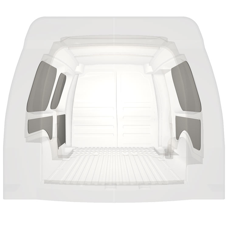 Let panelbeklædning til de indvendige vægge i en Volkswagen Caddy Maxi med en sidedør til højre. Beklædningen skaber et lyst og behageligt arbejdsmiljø og er nem at rengøre.