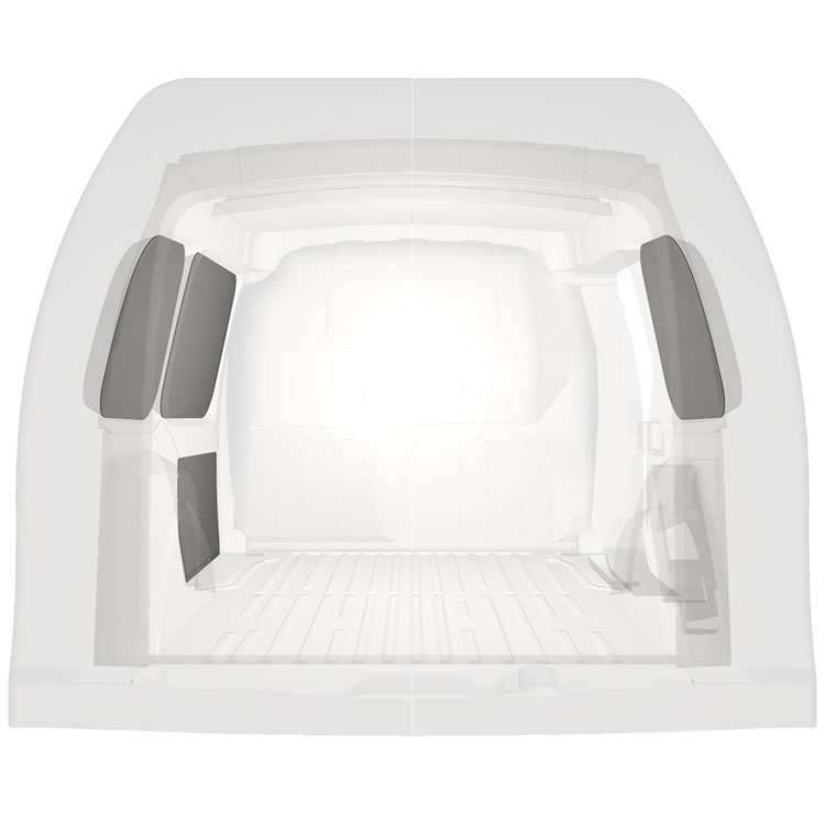 Let panelbeklædning til de indvendige vægge i en Mercedes Citan / Renault Kangoo med en sidedør til højre. Beklædningen skaber et lyst og behageligt arbejdsmiljø og er nem at rengøre.