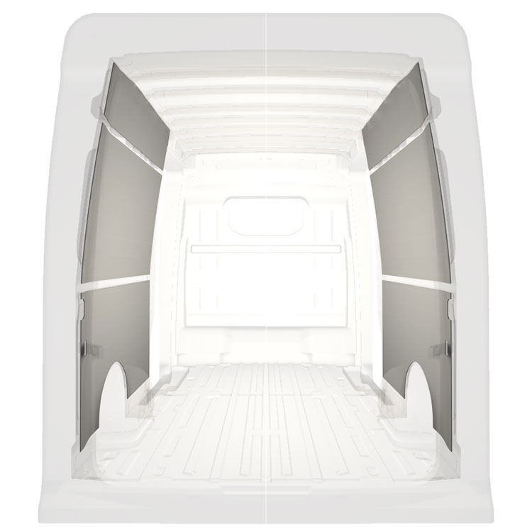 Let færdiglavet beklædning til de indvendige vægge af en Volkswagen Crafter / MAN TGE ned dobbelte sidedøre. Beklædningen skaber et lyst og behageligt arbejdsmiljø og er nem at rengøre.
