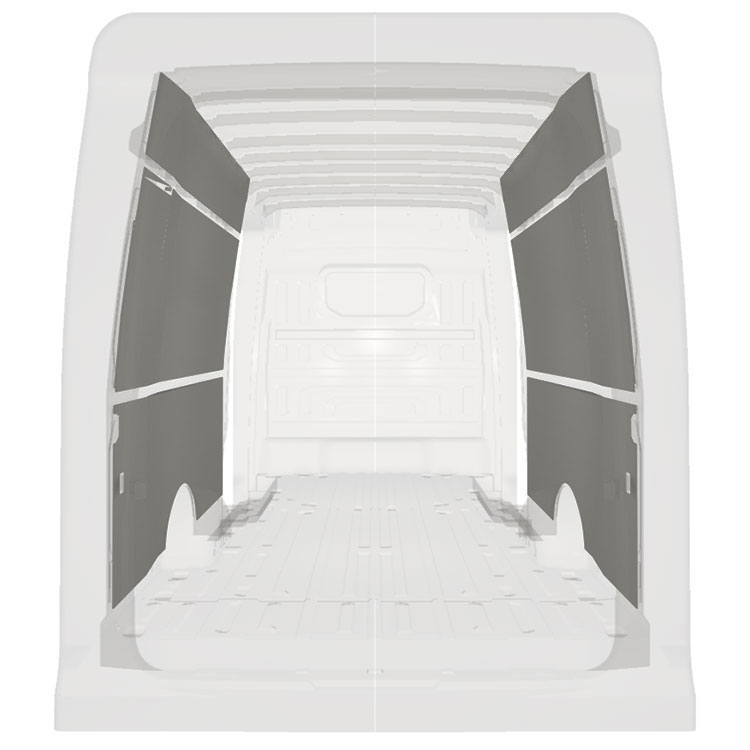 Let færdiglavet beklædning til de indvendige vægge af en Volkswagen Crafter / MAN TGE ned dobbelte sidedøre. Beklædningen skaber et lyst og behageligt arbejdsmiljø og er nem at rengøre.