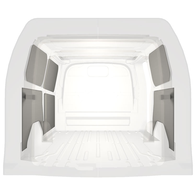 Let panelbeklædning til de indvendige vægge i en Ford Transit Custom med en sidedør til højre. Beklædningen skaber et lyst og behageligt arbejdsmiljø og er nem at rengøre.