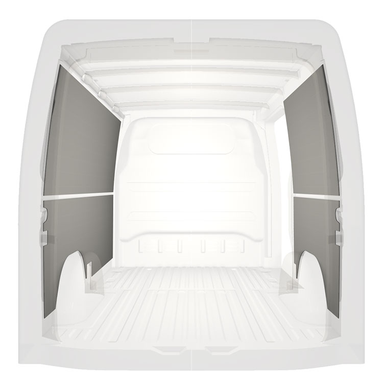 Let panelbeklædning til de indvendige vægge i en Mercedes Sprinter med en sidedør til højre. Beklædningen skaber et lyst og behageligt arbejdsmiljø og er nem at rengøre.