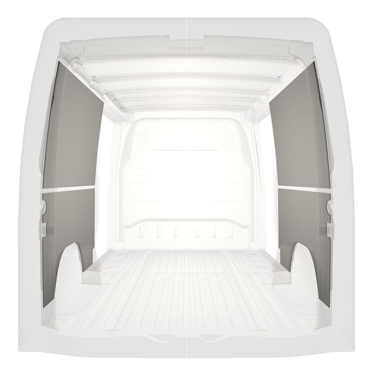 Let færdiglavet beklædning til de indvendige vægge af en Mercedes Sprinter ned dobbelte sidedøre. Beklædningen skaber et lyst og behageligt arbejdsmiljø og er nem at rengøre.