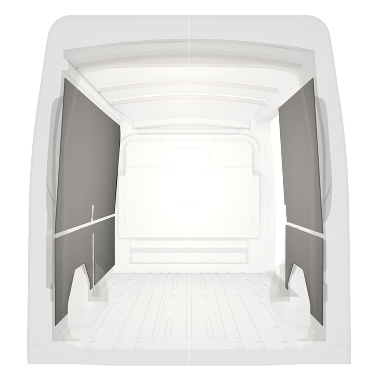 Let panelbeklædning til de indvendige vægge i en Ford Transit med en sidedør til højre. Beklædningen skaber et lyst og behageligt arbejdsmiljø og er nem at rengøre.