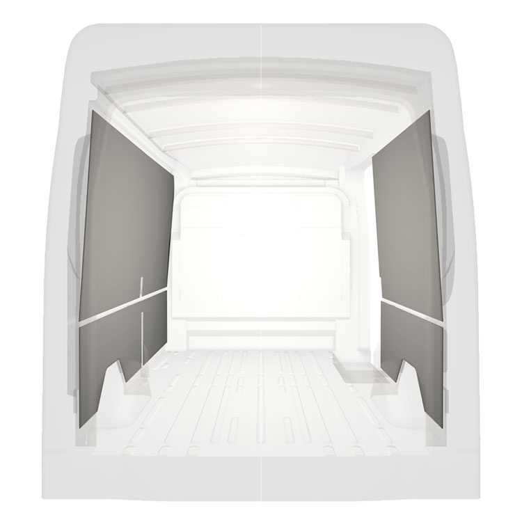 Let panelbeklædning til de indvendige vægge i en Ford Transit med en sidedør til højre. Beklædningen skaber et lyst og behageligt arbejdsmiljø og er nem at rengøre.