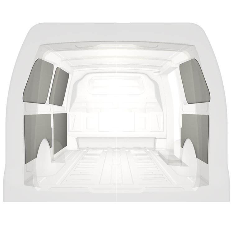 Let panelbeklædning til de indvendige vægge i en Mercedes Vito med en sidedør til højre. Beklædningen skaber et lyst og behageligt arbejdsmiljø og er nem at rengøre.