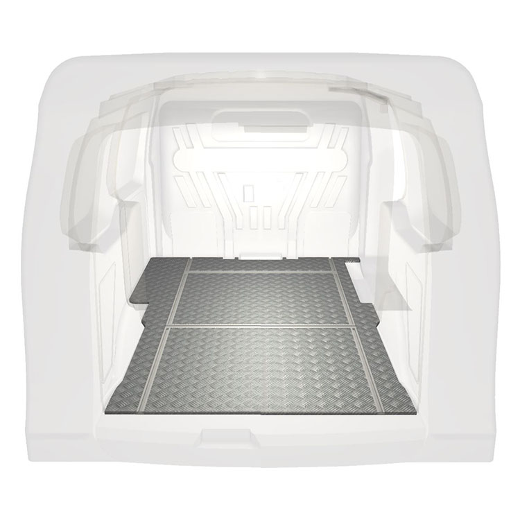Lette og robuste gulve til varebiler med tværgående skinner til en Ford Transit Connect med skridsikker aluminiumsplade og lastskinner (langsgående og tværgående) for hurtig og sikker installation af indretningssystemer og andet tilbehør.