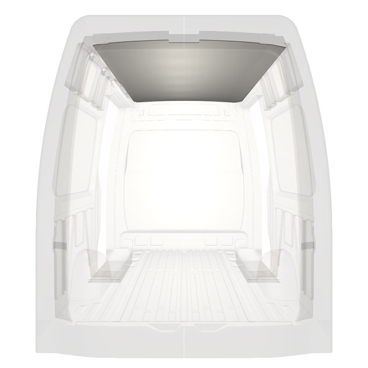 Let beklædning til taget på en Mercedes Sprinter. Tagbeklædningen vil skabe en lys professionel finish indvendigt og et behageligt arbejdsmiljø.