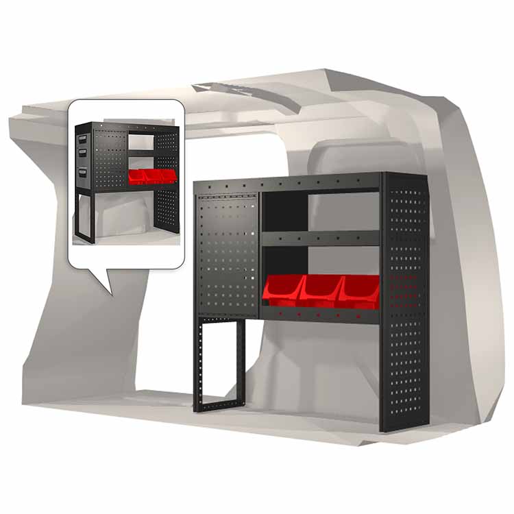 Indretningsforslaget er specielt designet til at passe valgte bilmodel perfekt. For øget funktionalitet og reduceret støj under kørslen er alle hylder udstyret med gummimåtter og skuffer med skum. Monteringssæt medfølger.