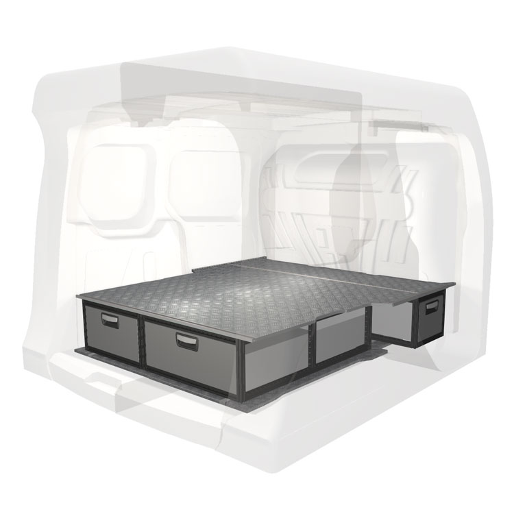 The kit is designed to be fitted on top of a Modul-Floor, utilizing the floor rails for a non-intrusive installation. The double floor is equipped with rails for easy installation of vehicle racking, and edging strips for a nice finish.