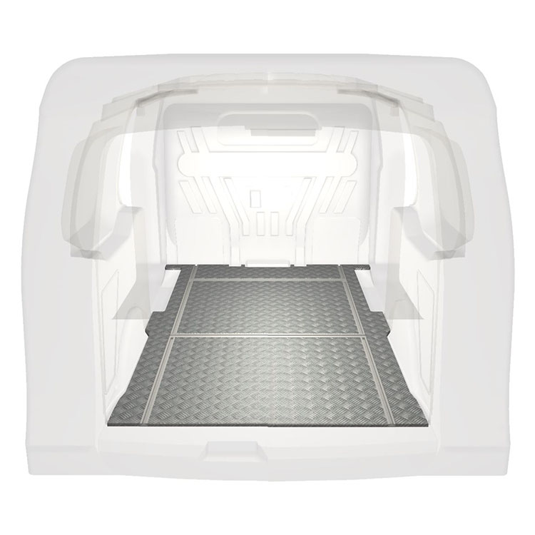 Lette og robuste gulve til varebiler med tværgående skinner til en Ford Transit Connect med skridsikker aluminiumsplade og lastskinner (langsgående og tværgående) for hurtig og sikker installation af indretningssystemer og andet tilbehør.