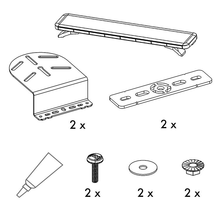 Kit bestående af en lysbro og et komplet sæt af beslag til installation direkte på køretøjets OEM-fikspunkter. Ved at udnytte de integrerede fikspunkter behøves der ikke bores unødvendige huller i køretøjets karrosseri, hvilket eliminerer risikoen for rust og beskytter køretøjets brugtvognspris.