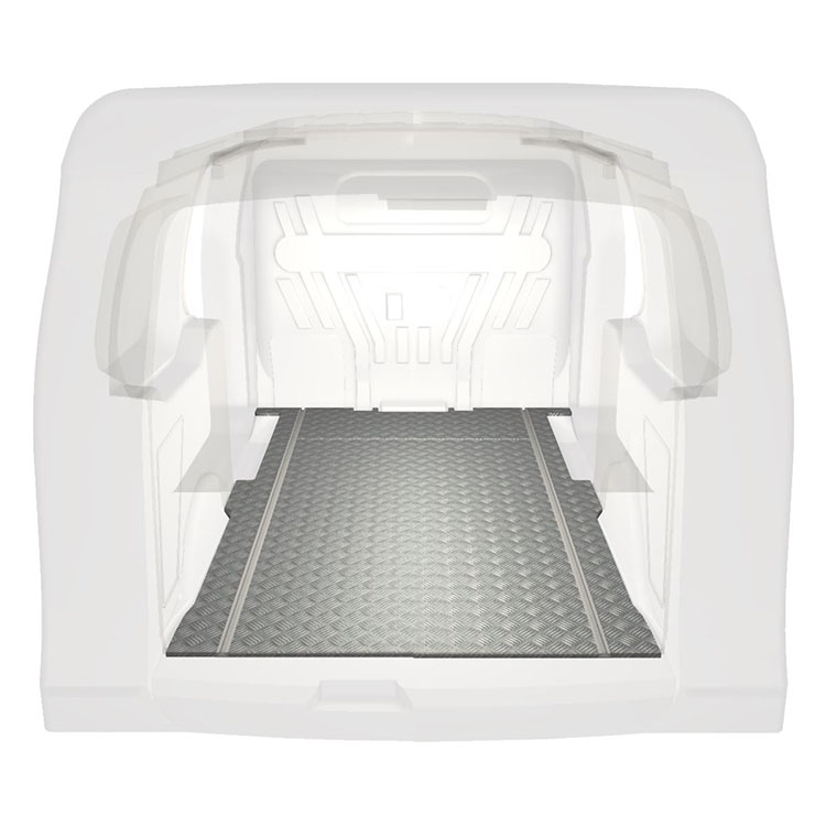 Lette og robuste ekstra lange gulve til en Ford Transit Connect med skridsikker aluminiumsplade og lastskinner (langsgående) for hurtig og sikker installation af indretningssystemer og andet tilbehør.
