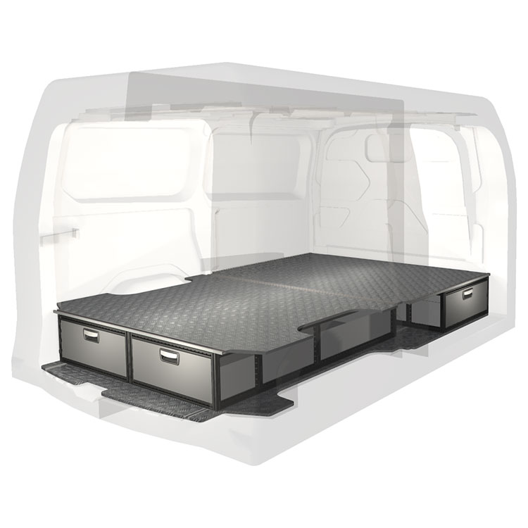 The kit is designed to be fitted on top of a Modul-Floor, utilizing the floor rails for a non-intrusive installation. The double floor is equipped with rails for easy installation of vehicle racking, and edging strips for a nice finish.
