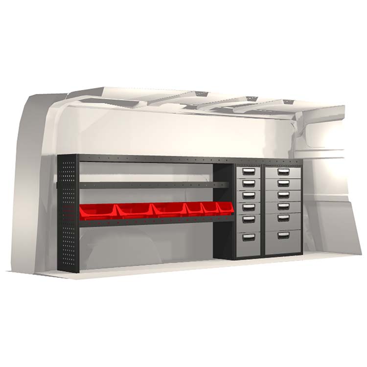 Indretningsforslaget er specielt designet til at passe valgte bilmodel perfekt. For øget funktionalitet og reduceret støj under kørslen er alle hylder udstyret med gummimåtter og skuffer med skum. Monteringssæt medfølger.