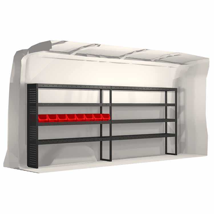 Indretningsforslaget er specielt designet til at passe valgte bilmodel perfekt. For øget funktionalitet og reduceret støj under kørslen er alle hylder udstyret med gummimåtter og skuffer med skum. Monteringssæt medfølger.
