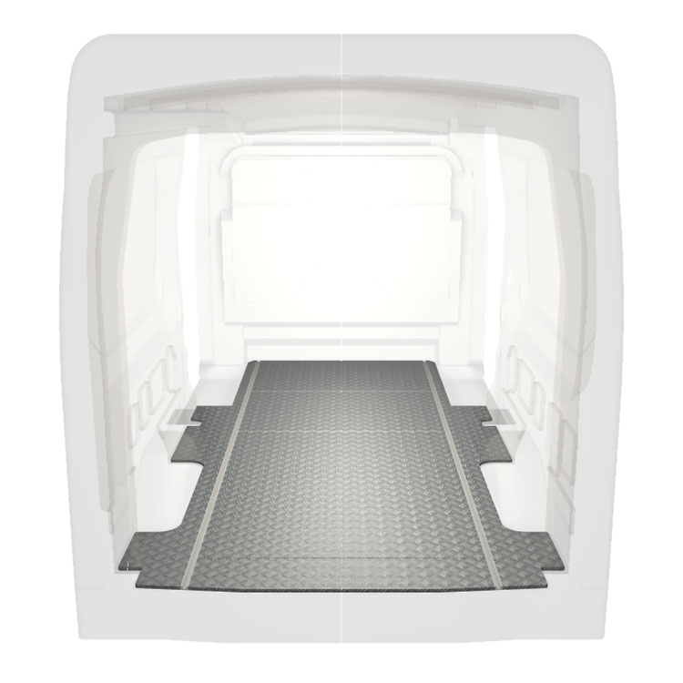 Lette og robuste standardgulve til varebiler til en Ford Transit med skridsikker aluminiumsplade og lastskinner (langsgående) for hurtig og sikker installation af indretningssystemer og andet tilbehør.