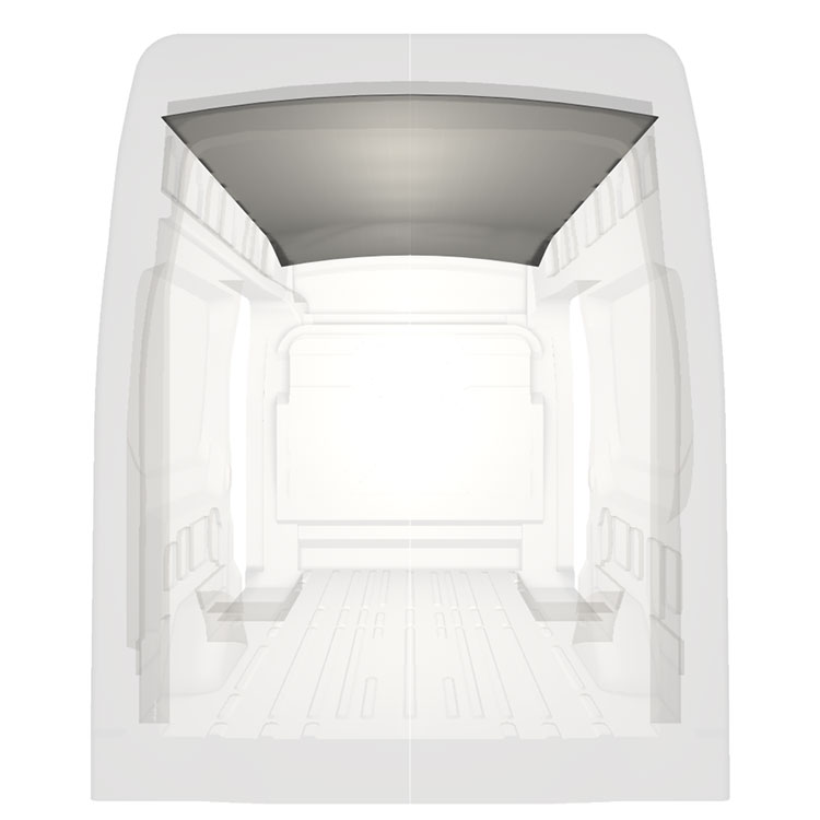 Let beklædning til taget på en Ford Transit. Tagbeklædningen vil skabe en lys professionel finish indvendigt og et behageligt arbejdsmiljø.