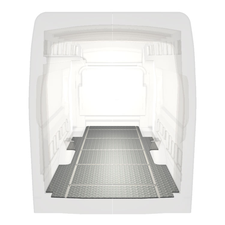 Lette og robuste gulve til varebiler med tværgående skinner til en Ford Transit med skridsikker aluminiumsplade og lastskinner (langsgående og tværgående) for hurtig og sikker installation af indretningssystemer og andet tilbehør.