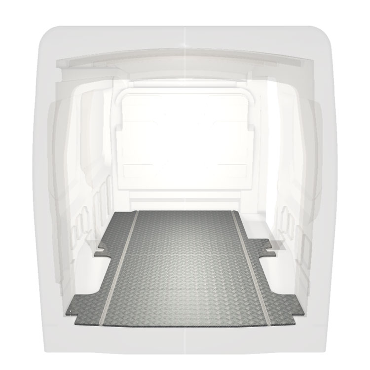 Lette og robuste standardgulve til varebiler til en Ford Transit med skridsikker aluminiumsplade og lastskinner (langsgående) for hurtig og sikker installation af indretningssystemer og andet tilbehør.