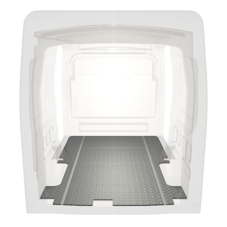 Lette og robuste standardgulve til varebiler til en Ford Transit med skridsikker aluminiumsplade og lastskinner (langsgående) for hurtig og sikker installation af indretningssystemer og andet tilbehør.