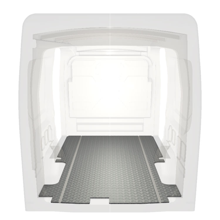 Lette og robuste ekstra lange gulve til en Ford Transit med skridsikker aluminiumsplade og lastskinner (langsgående) for hurtig og sikker installation af indretningssystemer og andet tilbehør.
