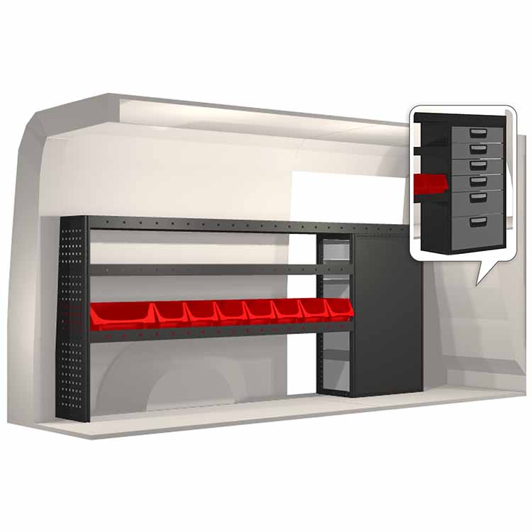 Indretningsforslaget er specielt designet til at passe valgte bilmodel perfekt. For øget funktionalitet og reduceret støj under kørslen er alle hylder udstyret med gummimåtter og skuffer med skum. Monteringssæt medfølger.